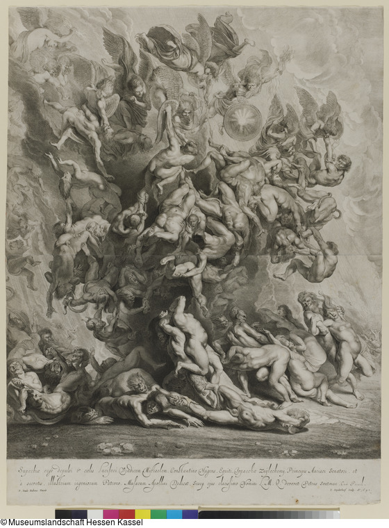 Nach dem Gemälde von Peter Paul Rubens "Das Kleine Jüngste Gericht" (gegenseitig), München, Alte Pinaktothek (Inv.-Nr. 611). Der Stich befand sich ehemals in einem Klebeband mit Reproduktionsgraphik nach Rubens, der aufgelöst wurde. Die Auflösung wurde nicht dokumentiert und das Inhaltsverzeichnis des Bandes hat sich nicht erhalten. Siehe den Kommentar zum aufgelösten Band [Rubens, aufgelöst].