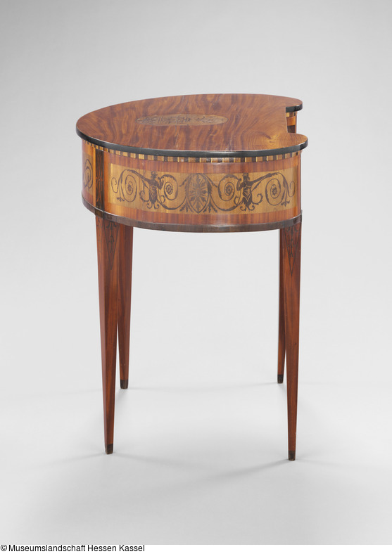 Den Bedürfnissen der immer raffinierter werdenden Lebensformen in der zweiten Hälfte des 18. Jahrhunderts folgend, wird eine Fülle neuer Möbelformen entwickelt. Architekten und Dessinateure entwerfen Kleinmöbel, die leicht beweglich auf Rollen laufend oder leicht zu tragen überall im Raum nach Bedarf zum Einsatz kommen. Dazu gehören auch Lesetischchen, die an einen günstig beleuchteten Platz oder an den Kamin gestellt werden können. Das kleine, bohnenförmige Tischchen auf hohen, schlanken Beinen verrät seine Funktion an der Front: Bücher scheinen griffbereit aufgereiht zu stehen. Tatsächlich verschließt das aus Bücherrücken hergestellte Rouleau zwei übereinander liegende Schubladen mit Inneneinteilungen. Das Möbel hat ein Gegenstück, das zum Besitz Karl Friedrich von Erthal (1719-1802), Kurfürst von Mainz, gehörte und sich heute im Schlößchen Schönbusch in der Nähe von Aschaffenburg befindet (s. Kreisel, Bd. 3, 1978, Nr. 158).