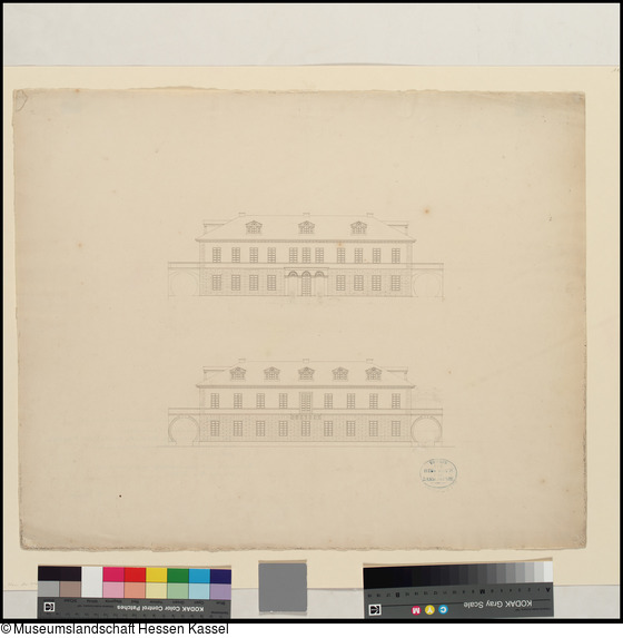 Beschriftungen: verso: "M. A.: / Haus ´zur Arche Noah´ in Hanau, Französische Allee 19. / Neubau 1827 für Major J. Backmeister. / 1830 Palais der Herzogin Friederike von Anhalt-Bernburg. / 1873 Vereinshaus des Hanauer Bürgervereins. / 1945 zerstört. / Entworfen und wahrscheinli (mit Graphit);