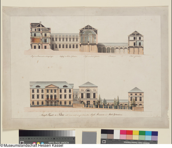Kassel, Weißes Palais, Präsentationszeichnung, Aufriß und Längsschnitt |
