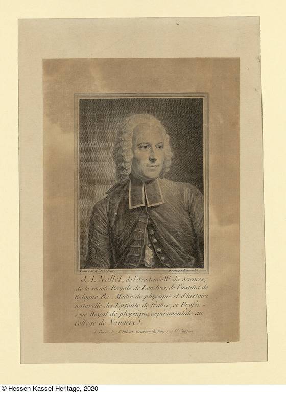 Bezeichnung: unten links: Peint par M.ce de la Tour. (Radierung); Bezeichnung: unten rechts: Gravé par Beauvarlet. (Radierung); Bezeichnung: unten mittig: J.A. Nollet, de l´Academie R.le des Sciences, / de la societé Royale de Londres, de l´institut de / Bologne, &c. Maitre de physique et d´histoire / naturelle des Enfants de france, et Profes- / seur Royal de physique expérimentale au / College de Navarre. (Radierung); Bezeichnung: unten mittig: A Paris chez l´Auteur Graveur du Roy rue St. Jacques (Radierung);