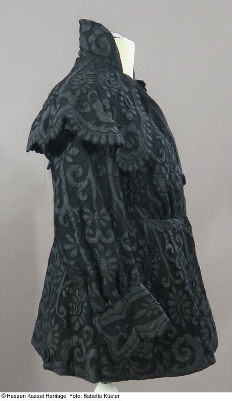Die Jacke hat eine relativ hohe Taillennaht, an der der ausgestellte Schoß angesetzt ist. Die langen Ärmel sind geshoppt und an den ausgestellten Manschetten angekraust. Der weit über die Schultern fallende Kragen läuft am Hals in einen hohen Kelch aus.