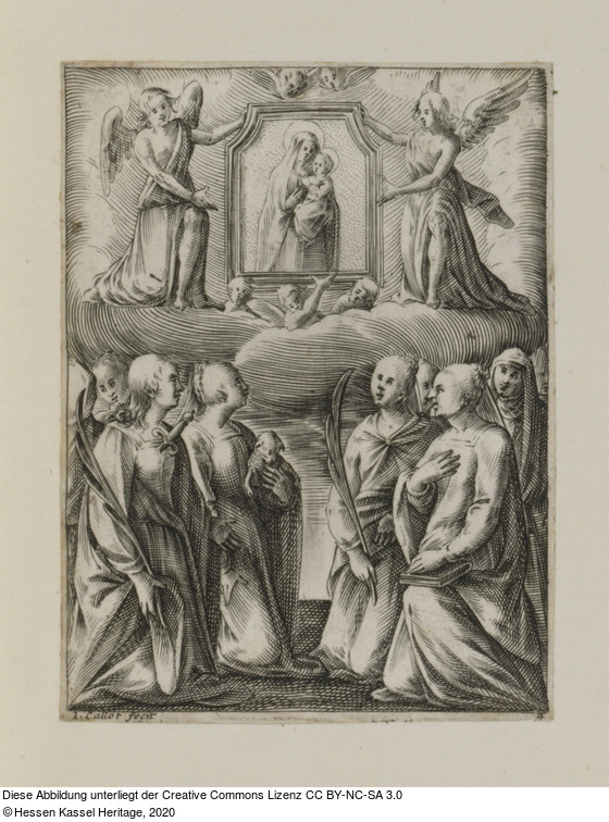 | Hist. Inhaltsverzeichnis: | 3 | ––,,–– [Une S. Vierge] avec le petit Jesus dans un tableau tenu par deux anges; / au bas une famille des Saintes. |