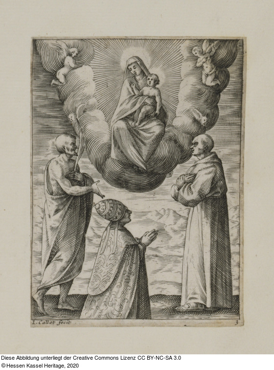 | Hist. Inhaltsverzeichnis: | 3 | ––,,–– [Une S. Vierge] avec le petit Jesus dans les nues; au bas un Pape priant / & deux Religieux à cotés. |