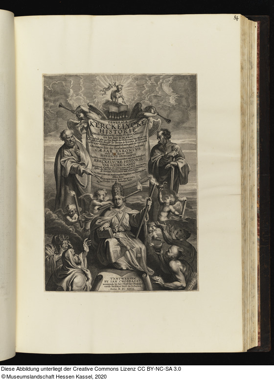 in der Platte: GENERALE KERCKELYCKE HISTORIE Van de Gheboorte onses H. Iesu Christi ... Ghemaeckt door den Doorluchtichsten Cardinael CÆSAR BARONIVS ende den Eerw. Heer HENRICVS SPONDANVS ... Ghetrocken wt Authentycke Registers en Chronycken Alles door HERIBERTVS ROS-WEYDVS Priester der Societeyt IESV.; T'ANTWERPEN BY IAN CNOBBAERT woonende by het Huys der Professen vande Societeyt IESV, in S. Peeter Anno M.DC.XXIII.; P. P. Rubens inu. L. Vorsterm. sculp.;