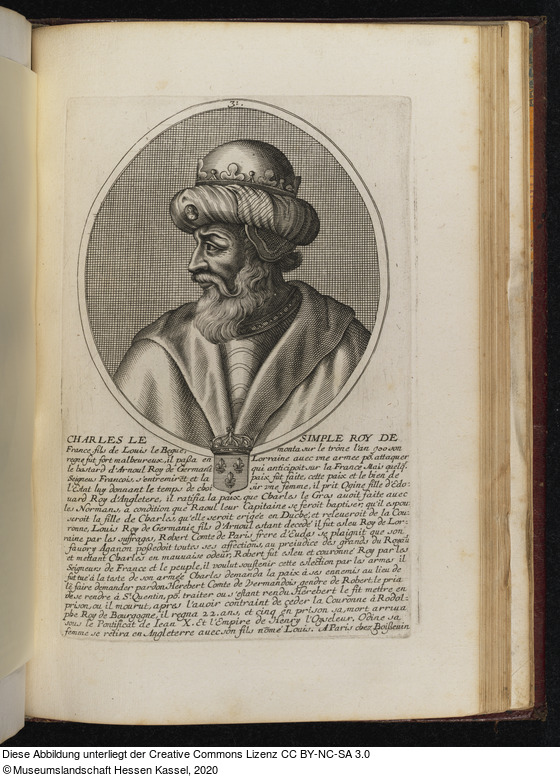 in der Platte: 31.; CHARLES LE SIMPLE ROY DE France, fils de Louis le Begue ... Odine sa femme se retira en Angleterre auec son fils nomé Louis.; A Paris chez Boißeuin;