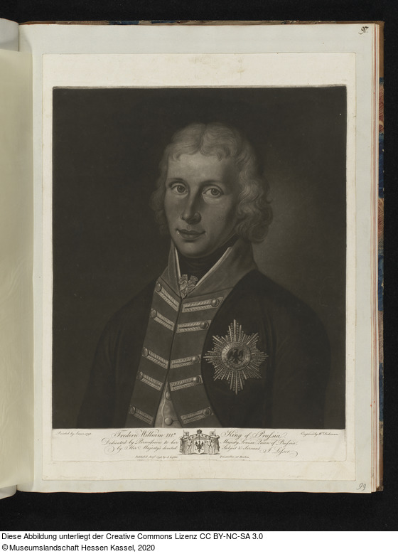 in der Platte: SUUM CUIQUE; Painted by Lauer 1798.; Engraved by W. Dickenson; Frederic William III.D King of Prussia. Dedicated by Permission to her Majesty, Louisa Queen of Prussia, by her Majesty's devoted Subject & Servant, J. Lesser.; Publish'd Aug.st 1798, by J. Lesser, Printseller, at Berlin.;