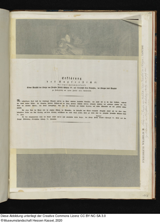 Typendruck: Erklärung des Kupferstichs: die letze Zusammenkunft Seiner Majestät des Königs von Preussen Friedrich Wilhelm III. mit Allerhöchst Dero Gemahlin, der Königin Luise Majestät zu Hohenzieritzam 19ten Julius 1810. darstellend.; Mit wehmütigem Ernst blickt der tiefgebeugte Monarch nach der im Bette ruhenden sterbenden Gemahlin, ihre Hand fest in die seine drückend, während ihre beiden ältesten Söhne, der Kronprinz Friedrich Wilhelm und der Prinz Friedrich Wilhelm Ludewig Königliche Hoheiten mit gefaltenen Händen vor dem Bette der leidenden Mutter, von Gram niedergebeugt, knien und die Sterbende mit frommer Ergebung und milder Mutterliebe auf ihre geliebten Kinder hinblickt. Am oberen Theil des Bettes steht die erhabene Schwester der Monarchin, die Prinzessin von Solms=Braunfels Königliche Hoheit mit der Frau Oberhofmeisterin Gräfin von Voss Excellenz, aus deren Stellung und Mienen der tieffste Gram spricht; ihnen zur Seite steht der Königliche Preußische Geheime=rath Dr. Heim. An dem entgegengesetzen Ende des Bettes erblickt man die noch anwesenden beiden Aerzte, den Königl. Preuß. (General=) Staabs=Chirurgus Dr. Görke und den Herzogl. Meklenburg=Strelitzischen Leibarzt, Dr. Hieronimn.;