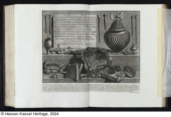 Beschriftungen: in der Platte: Tom. II. XLIX; DIMANESMANESSITISIAMMORTEMISELLIS ... L VMBRIVS SATVRNINVS; Iscrizione, e Frammenti delle Camere sepolcrali della Villa de Cinque.; A Aghi di Avorio ... E della Tavola antecedente; Piranesi Architetto dis. ed inc.;