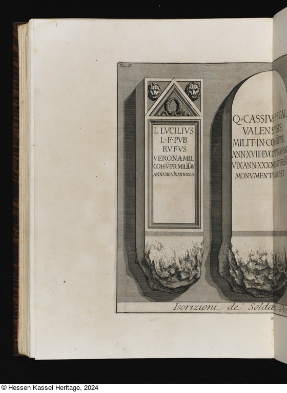 Beschriftungen: in der Platte: Tom. II. LIV; L LVCILIVS L F PVB ... ANN XXXVI I F P V I A P II; Iscrizioni de' Soldati Pretoriani; Piranesi Arch.to d. et inc.;