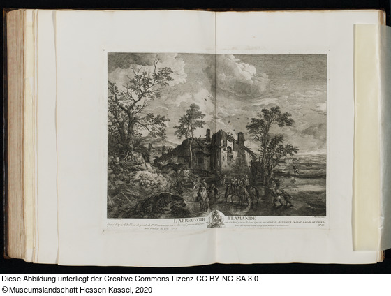 Beschriftungen: in der Platte: P. Wouvermens Pinxit; J. Moyreau Sculpsit; L'ABREUVOIR FLAMANDE.; Gravé d'Après le Tableau Original de P.pe Wouwermens, qui a dix neuf pouces de large, sur dix huit pouces de haut, Qui est au Cabinet de MONSIEUR CROSAT BARON DE THIERS.; Avec Privilége du Roi. 1757. AP[ligiert]aris chés Moyreau Graveur du Roi rue des Mathurins la 4e. Porte Cochere.;