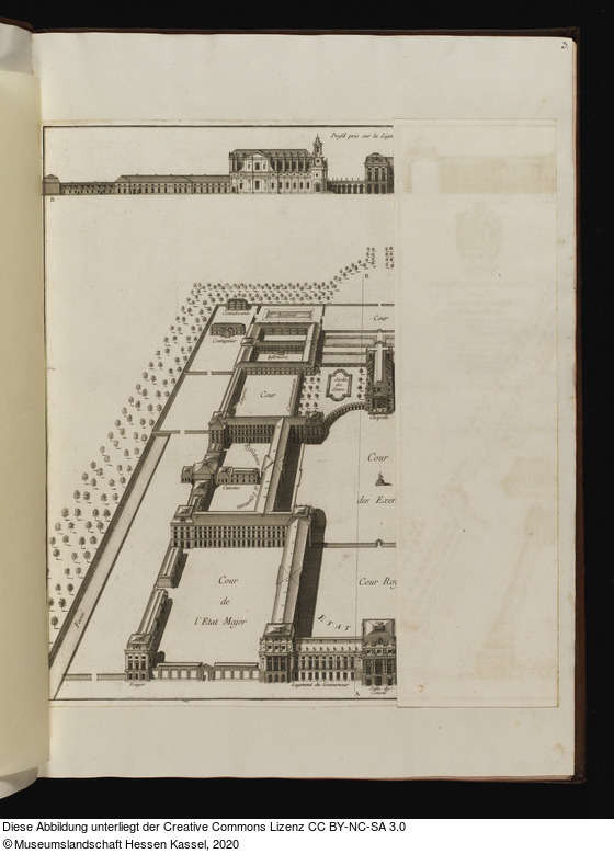 Den Entwurf für die École Militaire stammt von dem Architekten Ange-Jacques Gabriel. Abel François Poisson de Marigny, dem der Stich gewidmet ist, übernahm die Bauaufsicht des Gebäudekomplexes. Aus der Inschrift geht nicht hervor, ob G. L. Le Rouge den Stich wirklich stach oder ob er nicht einen anderen Stecher dafür beauftragte. Möglicherweise entstand das Blatt auch 1752, zeitgleich mit dem auf fol. 4 befindlichen, datierten Stich. |