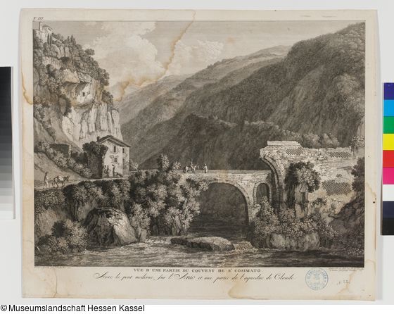 Beschriftungen: No. III. / Peint à Gouache par J. Ph. Hackert 1780. / Gravé à l'eau forte par B. A. Dunker / et terminé par George Hackert. / VUE D'UNE PARTIE DU COUVENT DE ST. COSIMATO. / Avec le pont moderne sur l'anio et une partie de l'aqueduc de Claude;