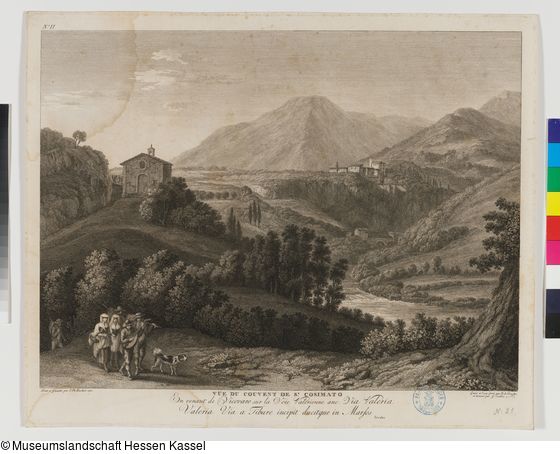 No. II. / Peint à Gouache par J: Ph: Hackert 1780. / Gravé à l'eau forte par B: A: Dunker / et terminé par G: Eichler. / VUE DU COUVENT DE ST. COSIMATO / En venant de Vicovaro sur la Voie Valérienne anc: Via Valeria / Valeria Via a Tibure incipit ducitque; Stempel: BLANCKENHAGEN / DROBBUSCH; Handschrift: unten rechts: N. 21. (mit Bleistift);
