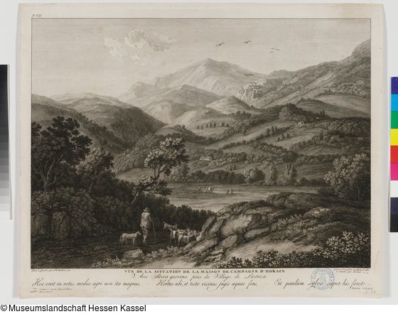 No. VII. / Peint à Gouache par J: Ph: Hackert 1780. / Gravé à l'eau forte par B. A. Dunker / et terminé par Lorieux. / VUE DE LA SITUATION DE LA MAISON DE CAMPAGNE D'HORACE / Avec Roccagiovine prise du Village de Licenza / Hoc erat in votis: modus agri no; Stempel: BLANCKENHAGEN / DROBBUSCH; Handschrift: unten rechts: N. 26. (mit Bleistift);