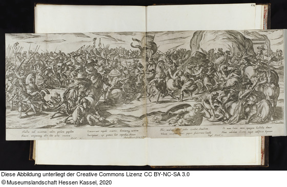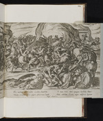 Beschriftungen: in der Platte: Ant. tempesti fecit; Cesar. de. or. in; Sta Fo Ro 1591; Hasta sub exsertam ... luit improbus Aruns; Aenid. x; Hic medias inter ... rapit indefessa bipennem; Virgil Aenid xjj; Andrea Vaccario forma in Roma;