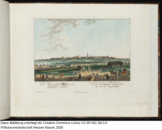 Beschriftungen: in der Platte: 43.; Nach der Natur gezeichnet und gestochen von C. Schütz in Wienn 1785.; Die Residenzstadt Wien von der Josephstadt anzusehen.; Vue de la Capitale de Vienne prise du côté du Joseph Stadt.; Cum. Priv. S.C.M.; Jn Wien bey Artaria Compl.;