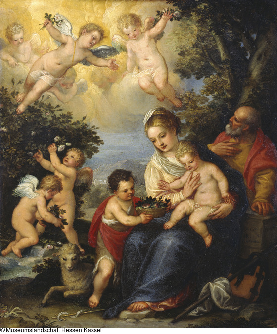 Die Heilige Familie mit Johannes dem Täufer und blumenspendenden Engeln |