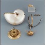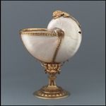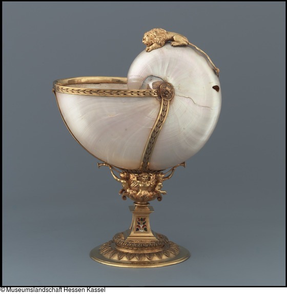 Der elegante Nautiluspokal gehörte schon im dem 16. Jahrhundert zu den exotischen Raritäten im Schatz der Landgrafen und zählt bis heute zu den ältesten Beispielen seiner Art. Lange bevor der Fernhandel größere Mengen der schimmernden Molluskenschalen nach Europa brachte, erhielt Landgraf Philipp der Großmütige den gefassten Nautilus von einem Mitglied der Augsburger Kaufmannsfamilie Welser zum Geschenk. Das Silberinventar von 1559 führt ihn unter der Rubrik „Perlmutter“ auf als: „Eine [sic!] so welser geschenckt, hat oben ein vergulten Lewen“ (Drach 1888, S. 14). Anton I. Welser hatte 1498 mit Konrad Vöhlin die Welser-Vöhlin-Gesellschaft gegründet, die 1505/06 im Geleit einer portugiesischen Flotte nach Indien segelte, um Gewürze, Baumwolle, Perlen und Edelsteine zu importieren. Die fremdländische Konchylie könnte damals nach Augsburg gelangt sein, wo sie der Goldschmied Stephan Kipfenberger um 1540 zu einem eleganten Pokal veredelte. Kipfenberger würdigte das rare Tiergehäuse mit einer zurückhaltenden Fassung, die dessen schimmernde Pracht herausstellt. Ein niedriger Schaft, aus dessen kugelförmigem Ende (Nodus) Sirenen und Tritonen hervorkommen, verleiht dem Schatz des Meeres eine thematisch passende Umrahmung. Der kleine grimmige Löwe, der das Meisterwerk bekrönt, wurde indessen als Anspielung auf das hessische Wappentier und als Sinnbild der Stärke gedeutet.