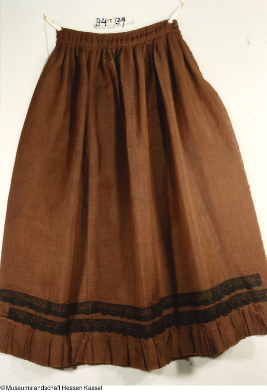 Aus zwei Stoffbahnen mit groben Vorstichen zusammengefügt, unten aufgesetztes Volant (Maschinennaht), darüber zwei Reihen Spitzenbesatz, der jeweils nicht ganz über die Breite reicht; oben gefältelt.