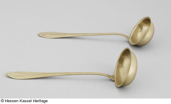 Ovale Schöpfkelle mit ausschwingendem, abgeplattetem Rand. Stiel am Ansatz geschwungen. Griff spitz auslaufend, mit ovalem Perlmuster verziert.