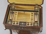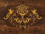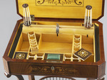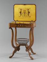 Mahagoni, Ahorn. Furnier: Mahagoni, Palisander, Ahorn, gelb gefärbt, Buchsbaum. Bein, Perlmutt, Metall, Textil. |