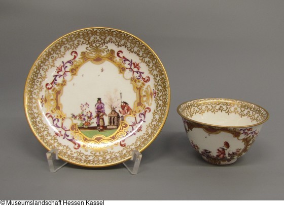 Porzellan, glasiert, Aufglasurmalerei, Goldstaffage |