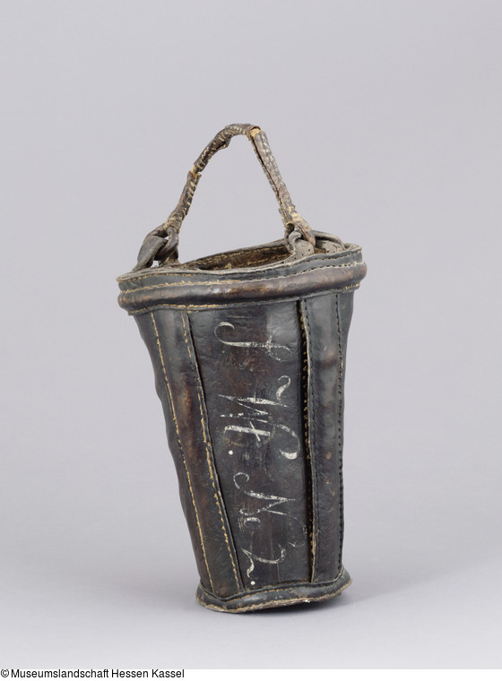 Das Stück besitzt eine konische Form. Es wurde aus einer Lederscheibe und mehreren Lederstreifen zusammengenäht. Holzstäbe geben dem Gefäß einen Halt. An 2 Ösen ist der Handgriff befestigt, der aus einem Seil besteht, das mit Leder umkleidet ist. Auf der Wandung ist mit weißer Farbe die Bezeichnung ''S.Wt. No 2.'' aufgemalt. Rokoko