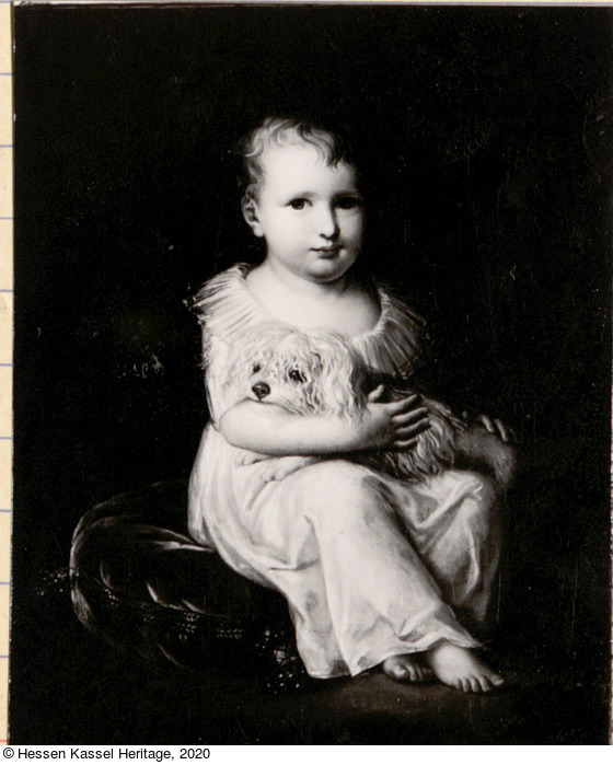 Bildnis eines vermutlich hessischen Prinzen in kindlichem Alter, im Hemdchen auf Kissen sitzend, mit einem weißen Zwergpinscher.