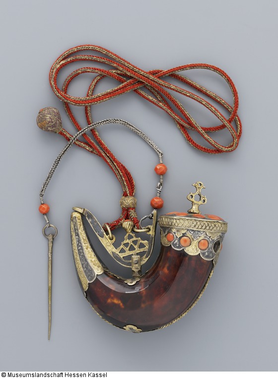 Körper aus Holz, mit facettiert geformten Schildpatt belegt. Das breite und das spitz zulaufende Ende wird von einer Silberlegierung eingefasst, die in den vergoldeten Bereichen mit floralen Musten graviert und in den silbernen nielliert ist (silberne und goldene Flächen im Wechsel). Am Bauch und Rücken verbinden zwei "Spangen" die Einfassungen. An der breiten Einfassung sind Korallen in Tropfen- und runder Form eingesetzt (eine runde Koralle fehlt). Mittels einer vergoldeten Buntmetallschraube kann das Füllloch aufgeschraubt werden. Der Verschluss der Schüttöffnung, der mittig in der Rückensenke befestigt ist, lässt sich etwas zur Seite drehen (sitzt sehr locker, schließt nicht richtig). An zwei Ösen am Verschluß ist eine zweifabige, geflochtene Schnur aus Metallahn und roter Seide befestigt, die an einem Ende in einer mit Metallahn umwickelter Perle endet. Eine silberne Kette mit einer Nadel/Stecher aus Buntmetall (?) und drei facettierten Korallenperlen hängt ebenfalls an einer der Ösen. (12.10.2012 AB, JD) |