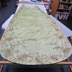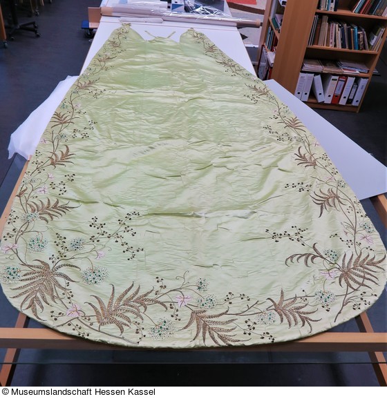 An der linken Längskante der Schleppe sind drei breite, cremefarbene Atlasbänder angenäht, die Spuren von drei Nahtstellen (resedagrüner Faden) aufweisen. Auf der Unterseite der Schleppe sind auf der rechten Längsseite und an jeweils zwei Stellen dazwischen ebenfalls Nahtspuren vorhanden. Möglicherweise wurde die Schleppe damit etwas zusammengerafft bzw. konnte mit diesen Querbändern aufgenommen und über den linken Arm gelegt werden.
