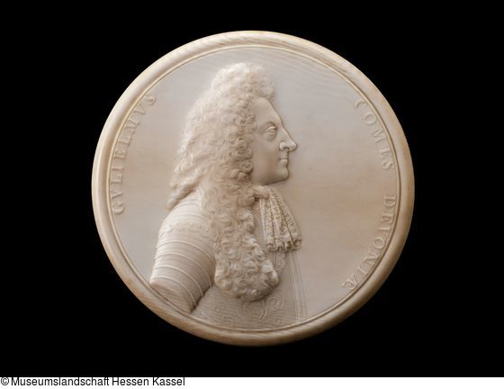 Das auf der Rückseite signierte und 1690 datierte Porträtmedaillon stellt William Cavendish dar, seit 1684 4. Earl und ab 1694 1. Herzog von Devonshire. Cavendish war Mitglied der Whigs im britischen Unterhaus und zählte dort zu den führenden Oppositionellen und Antikatholiken. Nach der Landung Wilhelms von Oranien-Nassau, des späteren Königs Wilhelm III. (KP B VI/II.76), in England, unterstützte er diesen in der Glorious Revolution und 1689 mit seinem Kavallerieregiment auch im Krieg gegen die Jakobiten in Irland. Im Rahmen der Krönungsfeierlichkeiten Wilhelms III. wurde er 1689 in den Hosenbandorden aufgenommen. Cavalier zeigt den Adligen mit Quarréperücke, Spitzenjabot und Harnisch mit Relief-Rankenwerk, allerdings ohne das Ordenszeichen des Hosenbandordens.