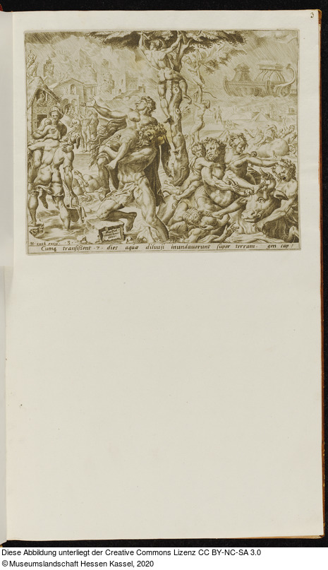 Beschriftungen: unten links in der Darstellung: Martin Hemskerc. inue.; H. cock excu. - 3 -; Cumq transißent - 7 - dies aquae diluuji inundauerunt super terram. gen cap (gestochen);