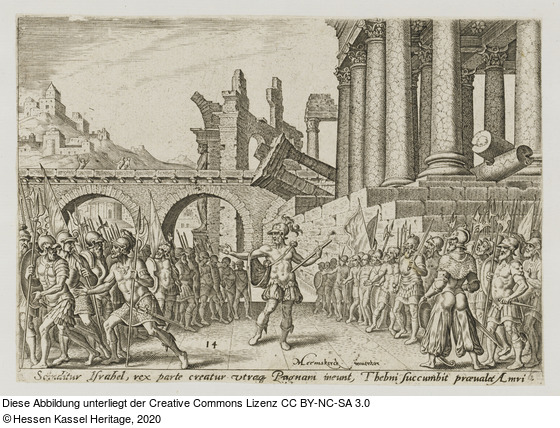 in der Platte: unten rechts in der Darstellung: 14; MHeemskerck [MH ligiert] inuentor; Scinditur Israhel, rex parte creatur utraq Pugnam ineunt, Thebni succumbit praeualet Amri. (gestochen);