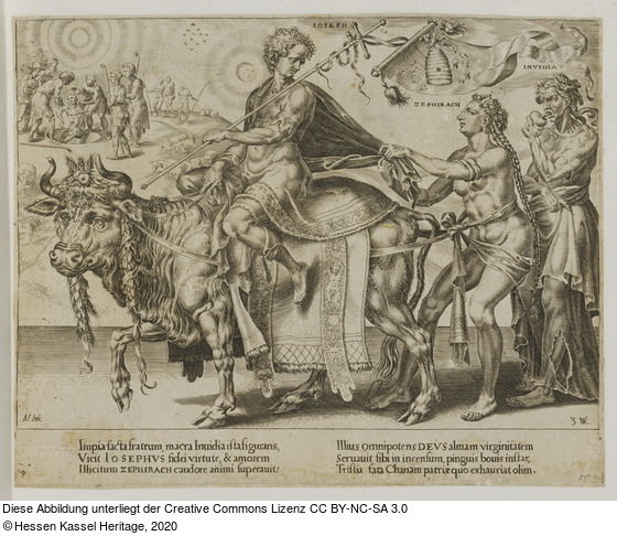 oben rechts in der Darstellung: IOSEPH; INVIDIA; ZEPHIRACH; M Inu.; 3 DVC. [DVC ligiert]; Impia facta fratrum, macra Inuidia istafigurans, Vicit IOSEPHVS fidei virtute, & amorem Illicitum ZEPHIRACH candore animi superauit. Illius omnipotens DEVS almam virginitatem Seruauit sibi in incensum, pinguis bouis instar, Tristia sata Chanam patriae quo exhauriat olim. (gestochen);