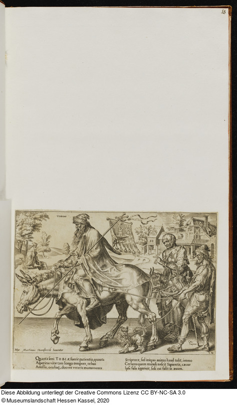 Handschrift: in der unteren linken Ecke mit Feder in Braun: 1[...]; in der unteren rechten Ecke mit Bleistift: 11; oben links in der Darstellung: TOBIAS; Caeca Paupertas.; MH Inu. [MH ligiert] Martinus Heemskerck Inuentor; 6 [gegenseitig] DVC [ligiert]; Quanta seni TOBIAE fuerit patientia, quauta Asperiras vitae tam longo tempore, rebus Amissis, oculisq[ue], docent veteris monumenta Scripturae, sed iniquo animo haud tulit, immo Cernerequem mundi nescit Sapientia, caecus Ipse fide agnouit, soli cui fidit in aeuum. (gestochen);