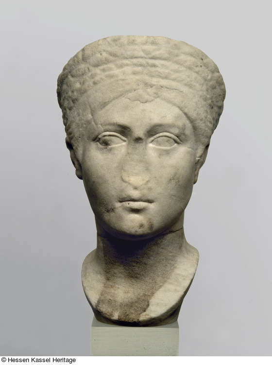 Das Bildnis ist anders als ursprünglich angenommen kein Werk der traianischen Zeit (Bieber 1915), sondern eine neuzeitliche Arbeit des 17. oder frühen 18. Jhs. (Boosen 1985/91). Sie orientiert sich an weiblichen Privatporträts der hadrianischen Epoche, für die eine solche Frisur aus Flechtzöpfen charakteristisch ist (Boosen 1985/91, Fittschen – Zanker 1985, Andreae 1995, Kersauson 1996, hier Kat. 4.10). Für eine insgesamt neuzeitliche Entstehung sprechen neben der Form der Büste (Boosen 1985/91; Müller-Kaspar 1988, 82 ff.) auch motivische Ungereimtheiten. Dazu zählt die Vermehrung der Zöpfe hinter den Ohren, die bei den antiken Vorbildern nicht belegt ist. Der Haarturban reicht am Hinterkopf zu weit hinab. An dieser Stelle wird an den Frauenporträts hadrianischer Zeit das Haar zunächst in gedrehten Strängen oder glatten Strähnen aufgenommen, um dann etwas weiter oben den Turban zu bilden. Die Gestaltung der Frisur auf dem Oberkopf weicht ebenfalls von den antiken Vorbildern ab. Statt quer verlaufender Wellen finden sich dort üblicherweise Flechtzöpfe oder glatte Strähnen, die nach hinten zum Nacken laufen. Die überstehenden Partien des Turbans weisen bei den antiken Vergleichsstücken auch auf ihrer Innenseite eine Flechtengliederung auf. Es ist anzunehmen, dass der neuzeitliche Bildhauer die Frisuren seiner antiken Vorbilder in ihrer Struktur nicht verstanden hat.