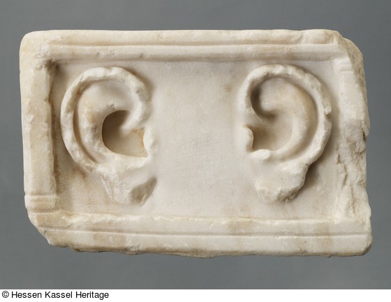 Das kleine querformatige Relief hat einen architektonischen Rahmen. Die Boden- und Deckleiste sind durch eine Längsrille facettiert. Je zwei Rillen auf den Antenpfeilern deuten Basen und Kapitelle an. Zwei lebensgroße, die gesamte Bildfeldhöhe beanspruchende Ohren stehen in einigem Abstand einander gegenüber. Die schönen runden und plastisch eingetieften Ohrmuscheln heben sich vom geglätteten Reliefgrund ab, der eine gemalte Inschrift getragen haben könnte. Der abgearbeitete Zapfen der Unterseite kann zum Einlassen in eine Wandnische oder auf einen Pfeiler gedient haben. Die Votive sind sowohl zum Dank wie zur Fürbitte für die Heilung von Ohrenkrankheiten in die Heiligtümer gestiftet worden. Der Typus und die schlichte ansprechende Ausführung sind von zahlreichen Weihgaben in griechischen Asklepiosheiligtümern wie dem am Südabhang der Athener Akropolis bekannt und werden allgemein der römischen Kaiserzeit zugewiesen.