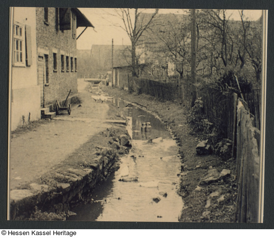 Der offene Verlauf der Fülle oder Calde in Calden. Das Wasser der Fülle war den Caldenern vielfältig von Nutzen: zum Tränken der Tiere, zum Bewässern der Hausgärten, zum Kühlen von Getränken und Milchkannen usw. Nach 1969 wurde sie verrohrt. Vgl. auch VK-X-7-104/16.