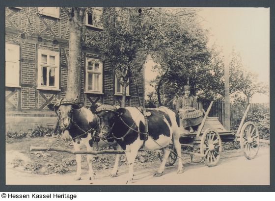 Bezeichnung: Marie Baumbach auf einem Kuhgespann vor einem markant geklinkten Fachwerkhaus