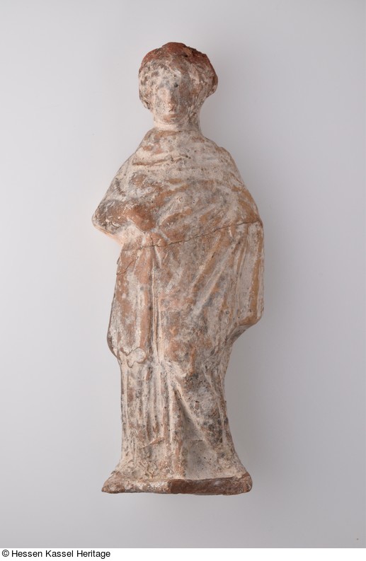 Das Mädchen steht auf flacher, etwas quadratischer Standplatte. Fußlanger Chiton. Knielanger Mantel. Beide Arme liegen angewinkelt vor dem Leib, die r. Hand rafft den Stoff, der l. Ellenbogen drückt ihn seitlich nach außen. Weites Lockenhaar über Stirn und Schläfen, darüber eine Haube (?).