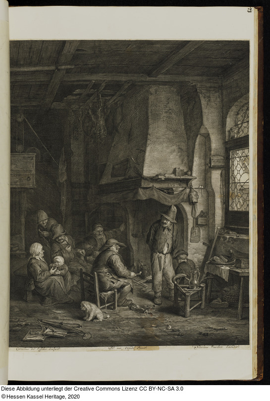 | Hist. Inhaltsverzeichnis: | 21. | Eine dergleichen [Trinckgesellschaft] vor dem Kamin, von 5 Manns= einer Frauensperson und zwey Kindern; unten lincks: Cornelius de Visscher / sculpsit; in der Mitte: Adr. van Ostade pinxit; rechts: Nicolaus Visscher excudit. |