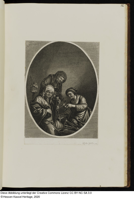 | Hist. Inhaltsverzeichnis: | 32. | Drey alte Weiber, die eine hält einen Napf, woraus die andere mit einem Löffel schöpft; die dritte hat ein Glas in der lincken Hand und / eine länglich viereckigte Bouteille im rechten Arm; Oben rechts im Kupfer: A. v. Ostade pinxit. J. Suÿderhoef sculpsit; / unten am Fuße rechts: Nicolaus Visscher excu. |