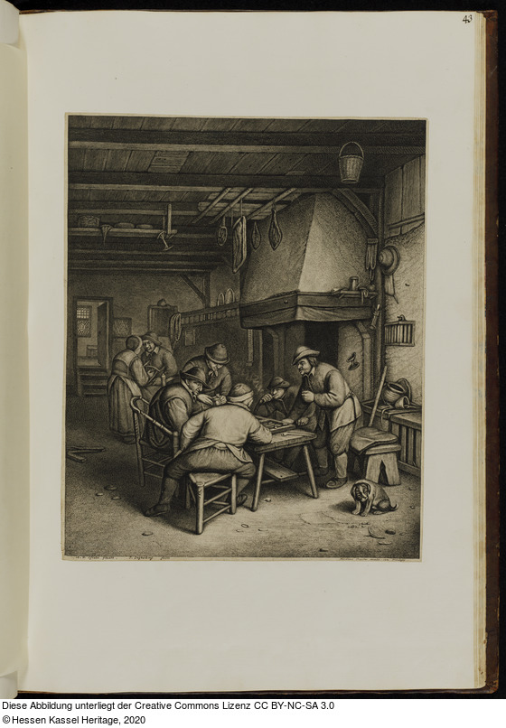 | Hist. Inhaltsverzeichnis: | 42. | Eine Trinckgesellschaft von 5 Personen an einem Tische, von denen zwey im Brete spielen; zur Seite eine Manns= und eine / Weibsperson, die miteinander sprechen; unten zur lincken: A. v. Ostade pinxit. J. Suyderhoef fecit; rechts: |