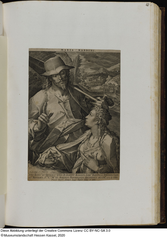 Beschriftungen: in der Platte: MARIA? RABBONI.; cu privelegio S. C. Maiestat.; PRO ILLVS.tri AC GENERO.so DNO D. IOANNI ALBERTO LIBEro BARONI À SPRIZENSTAIN ET NEVHAVS; S.cra C.re M.ti ET SERENISS. FERDINANDO ARCHIDVCI AVSTRiae. & c. À CONS. Pinxit Barth: Sprager, Ioan: Sadeler scalps:;