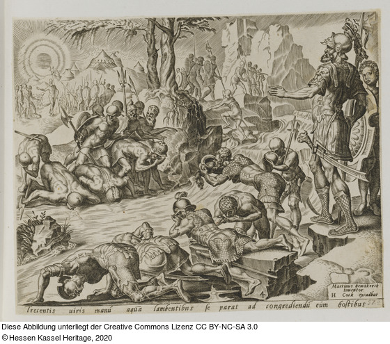 unten rechts in der Darstellung: 4; Martinus hemskerck inuentor H Cock excudbat; Trecentis uiris manu aqua lambentibus se parat ad congrediendu eum hostibus. (gestochen); unten links in der Darstellung: in der unteren rechten Ecke mit Bleistift: 57.b (gestochen);