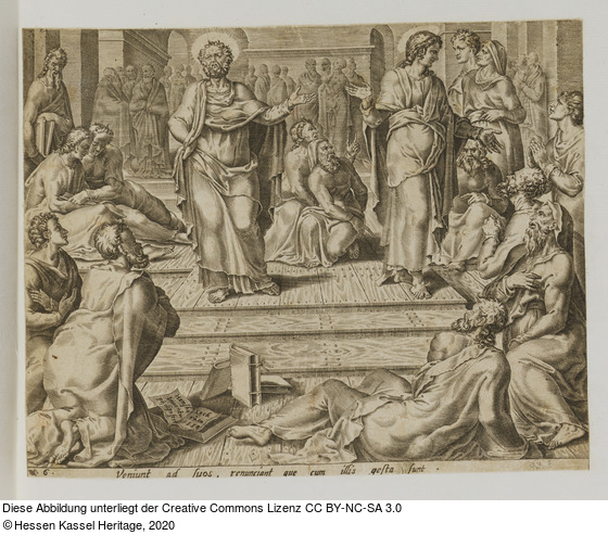 unten mittig in der Darstellung: in der unteren linken Ecke mit Feder in Schwarz: 8; unten rechts mit Bleistift: 63.b (gestochen); unten links in der Darstellung: Hemske Inuentor Philipe fec Cock excu 1558; .6. Veniunt ad suos, renunciant que cum illis gesta sunt. (gestochen);