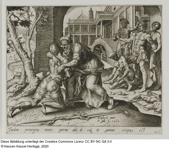 unten links in der Darstellung: Cock excu.; 4; MHemskerck [MH ligiert] inuen. P. galle f. 1562; Tandem poenitentia motns ... gratiam receptus est (gestochen);