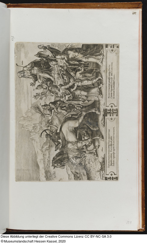 unten links in der Darstellung: Humilitas; Pax; Metus; Spes; Mansuetudo; Modestia; Caritas; Fides; MHemskerck [MH ligiert] inu H. cock excu.; TAPINOPHROSYNE currui TOLERANTIAE ... initium beatitudinis FIDES.; .7. (gestochen); unten unterhalb der Darstellung: am linken Rand mittig mit Feder in Braun: N. [?]; am unteren Rand rechts mit Feder in Braun: 37 [?]; darüber mit Bleistift: 101; auf der Buchseite links über dem Stich mit Bleistift: 137; in der unteren rechten Ecke der Buchseite mit Bleistift: 139 (gestochen);