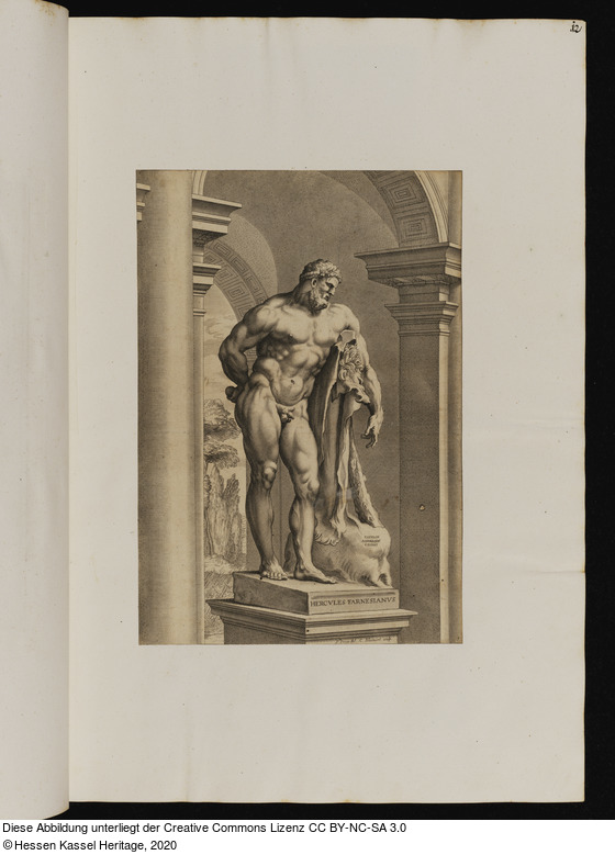 Unterhalb der Mitte horizontale Falte, geglättet. Unten weißlicher Fleck. Vertikaler Schnitt am linken Rand in der Buchseite. Le Blanc ordnet den Stich der Serie "Galleria Giustiniana del Marchese Vincenzo Giustiniani" zu (Rom 1631, 49 Bll. Vgl. Le Blanc I.376.149-197). Obwohl C. Bloemaert mehrere Stiche für diese Folge schuf, scheint der Herkules Farnese nicht dazu zu gehören. In der Serie findet sich lediglich ein anderer, von Claude Mellan gestochener Herkules. Der Stich Bloemaerts weicht zudem stilistisch von den Blättern der "Galleria Giustiniana" ab, welche die Statuen stets isoliert und ohne Umgebung zeigen. Bloemaerts Werk ist hingegen Teil von Giovanni Battista Ferraris Publikation "Hesperides Sive de Malorum Aureorum Cultura et Usu Libri Quatuor" (Rom 1646, S. 31). |